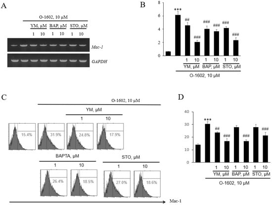 Effects of YM254890, BAPTA-AM, and STO-609 on O-1602-induced Mac-1 expression in THP-1 cells. THP-1 cells were pretreated with the indicated concentrations of inhibitors for 1 h, and then treated with 10 μM O-1602 for 24 h. The mRNA expression of adhesion molecules was analyzed by RT-PCR and flow cytometry. (A) Representative RT-PCR images. (B) Histograms showing the relative mRNA levels. (C) Representative flow cytometry images of Mac-1 proteins. (D) Histograms showing relative Mac-1 protein levels. The results are presented as the mean ± SEM of three independent experiments. Statistical significance: *** p < 0.001 vs. untreated control cells, ## p < 0.01, ### p < 0.001 vs. O-1602-treated cells.