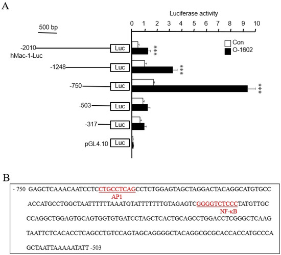 Cloning and characterization of the Mac-1 promoter involved in GPR55-mediated Mac-1 transcription. (A) THP-1 cells were co-transfected transiently with various promoter constructs and an empty luciferase vector pGL4.10 for 24 h, and then treated with or without 10 μM O-1602 for 24 h. The relative luciferase activity was presented as means ± SE of five independent experiments. Statistical significance: *** p < 0.001 vs. untreated control cells. (B) Nucleotide sequence of the promoter region of the Mac-1 gene. The sequence of the region between nt −750 and −503 bp of the 5′-flanking region is shown. The underlined sequences are possible transcription factor binding sites, as predicted by TFSEARCH.