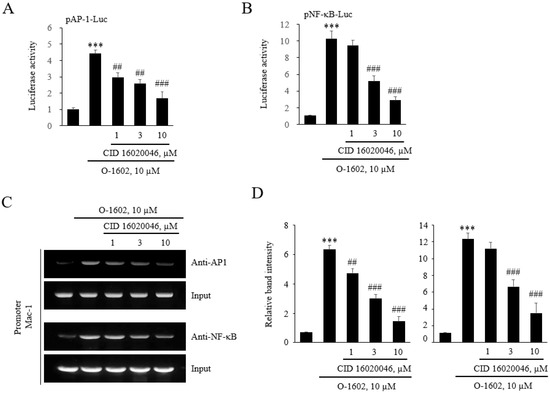 To assess whether GPR55 activation induced binding of AP-1 and NF-κB to the responsive sites, luciferase constructs containing tandem repeats of consensus sequences of AP-1 or NF-κB were used. The O-1602 treatment induced an increase in luciferase activity in pAP-1-Luc and pNF-κB-Luc, and these increases were suppressed by the CID16020046 treatment (Figure 8A,B), confirming that GPR55 activation leads to Mac-1 transcription via binding of AP-1 and NF-κB to the responsive sites in the promoter region of Mac-1. Next, we performed ChIP assays to directly assess whether GPR55 activation induced binding of AP-1 and NF-κB to the binding sites of the Mac-1 promoter region. After nuclear extraction from monocytes treated with O-1602 or O-1602 plus CID16020046, protein-DNA complexes were immunoprecipitated with anti-AP-1 or anti-NF-κB antibodies. Subsequent PCR amplification of the Mac-1 promoter showed increases in AP-1 and NF-κB binding to the Mac-1 promoter after the O-1602 treatment (Figure 8C). The increased binding was suppressed by CID16020046 treatment in a dose-dependent manner (Figure 8C,D), demonstrating that the binding of AP-1 and NF-κB participates in GPR55-mediated induction of Mac-1 expression.
