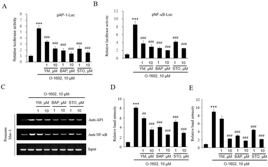 Effects of YM254890, BAPTA-AM, and STO-609 on O-1602-induced expression of AP-1 and NF-κB in THP-1 cells. THP-1 cells were pretreated with the indicated concentrations of inhibitors for 1 h, and then treated with 10 μM O-1602 for 24 h. Mac-1 mRNA, promoter activity, and protein expression were analyzed by reporter gene assay and chromatin immunoprecipitation (ChIP) assay. The AP-1 (A) and NF-B (B) luciferase activities are represented as the mean ± SEM from five to six independent experiments. (C–E) Binding of AP-1 and NF-κB to the Mac-1 promoter was detected by ChIP assay. Representative images (C) and quantitative histograms of the ChIP assay (D for AP-1 and E for NF-κB). The results are presented as the mean ± SEM of three independent experiments. Statistical significance: *** p < 0.001 vs. untreated control cells, ## p < 0.01 and ### p < 0.001 vs. O-1602-treated cells.