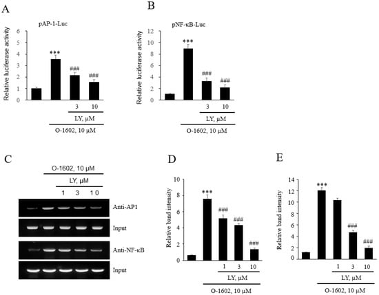 Effects of LY294002 on O-1602-induced expression of AP-1 and NF-κB in THP-1 cells. THP-1 cells were pretreated with the indicated concentrations of LY294002 for 1 h, and then treated with 10 μM O-1602 for 24 h. Mac-1 mRNA, promoter activity, and protein expression were analyzed by reporter gene assay and chromatin immunoprecipitation (ChIP) assay. The AP-1 (A) and NF-B (B) luciferase activities are represented as the mean ± SEM from five to six independent experiments. (C–E) Binding of AP-1 and NF-κB to the Mac-1 promoter was detected by ChIP assay. Representative images (C) and quantitative histograms of the ChIP assay (D for AP-1 and E for NF-κB). The results are presented as the mean ± SEM of three independent experiments. Statistical significance: *** p < 0.001 vs. untreated control cells, ### p < 0.001 vs. O-1602-treated cells.