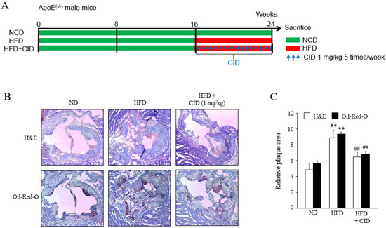 The ApoE KO mice were purchased from Jackson Laboratories. Animals were allowed free access to tap water and laboratory rodent chow at 20–22 °C and 50–60% relative humidity. All animal procedures conformed to the Guide for the Care and Use of Laboratory Animals published by the US National Institute of Health (NIH Publication No. 85-23, revised 1996), and the experimental protocols were approved by the Pusan National University Institutional Animal Care and Use Committee. In this study, 16-week-old mice were randomly divided into three groups: control (n = 5), in which mice were fed a normal chow for 8 weeks; HFD, in which mice (n = 6) were fed an HFD for 8 weeks; and HDF plus CID16020046, in which mice (n = 5) were fed an HDF for 8 weeks with CID16020046 (1 mg/kg) five days per week for the same 8 weeks (experimental scheme in Figure 11). The animal protocol used in this study was reviewed and approved by the PNU Institutional Animal Care Committee (PNU–IACUC) for compliance with the ethics of the procedures and animal care.