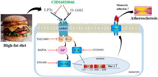 In this study, we reported the following: (1) GPR55 activation by O-1602 induced monocyte adhesion to endothelial cells via Mac-1 expression; (2) Mac-1 expression is regulated by binding of the transcription factors AP-1 and NF-κB to the nt −750 to −503 promoter region of Mac-1 in monocytes, (3) signaling cascades of GPR55 activation to Mac-1 gene expression are Gq/Ca2+/CaMKK and PI-3K, and (4) blockage of GPR55 protected against atherosclerosis progression along with improved lipid profiles, as shown in Figure 12. Therefore, our results are associated with several points, including monocyte adhesion, atherosclerosis protection, and improved lipid profiles.