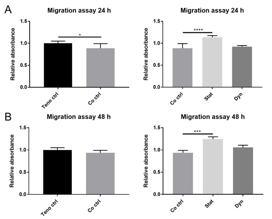 We first examined the effect of myoblast secretome on tenocyte migration in co-culture with mechanically unloaded myoblasts using a transwell assay. Myoblasts in co-culture with tenocytes significantly decreased the migration of tenocytes after 24 h (Figure 1A left panel) as compared with tenocytes alone; however, this effect was not seen at 48 h (Figure 1B left panel). Next, we tested whether static and dynamic loading of myoblasts could affect tenocyte migration. Dynamically loaded myoblasts did not affect tenocyte migration at 24 h or 48 h compared with unloaded myoblasts. However, statically loaded myoblasts significantly enhanced tenocyte migration at both 24 h and 48 h compared with unloaded myoblasts (Figure 1A,B right panel). The data suggest that there are differential responses in tenocyte migration capacity, relative to the type of loading on myoblasts. Furthermore, the secretome from statically loaded myoblasts does induce the migration of tenocytes.