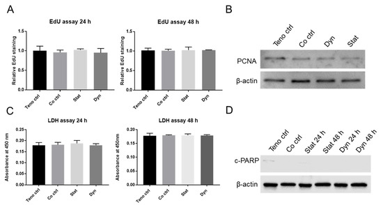 Cell proliferation and apoptosis of tenocytes co-cultured with/without mechanically loaded myoblasts. (A) Relative EdU counting in tenocytes co-cultured with mechanically loaded myoblasts. (B) Western blot images of PCNA in tenocytes after 48 h. (C) Quantification of LDH content in the medium. (D) Western blot images of c-PARP. Teno ctrl: tenocytes alone, Co ctrl: tenocytes co-cultured with myoblasts, Dyn: tenocyte co-cultured with dynamically loaded myoblasts, Stat: tenocyte co-cultured with statically loaded myoblasts. Data are represented as mean ± standard deviation. n = 3. One-way ANOVA with Tukey’s multiple comparisons was performed when comparing between Teno ctrl, Co ctrl, Dyn and Stat groups in (A,C).