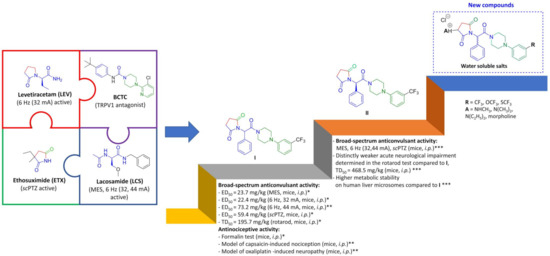- Abram, M.; Zagaja, M.; Mogilski, S.; Andres-Mach, M.; Latacz, G.; Baś, S.; Łuszczki, J.J.; Kieć-Kononowicz, K.; Kamiński, K. Multifunctional Hybrid Compounds Derived from 2-(2,5-Dioxopyrrolidin-1-Yl)-3-Methoxypropanamides with Anticonvulsant and Antinociceptive Properties. J. Med. Chem. 2017, 60, 8565–8579. [Google Scholar] [CrossRef] [PubMed]