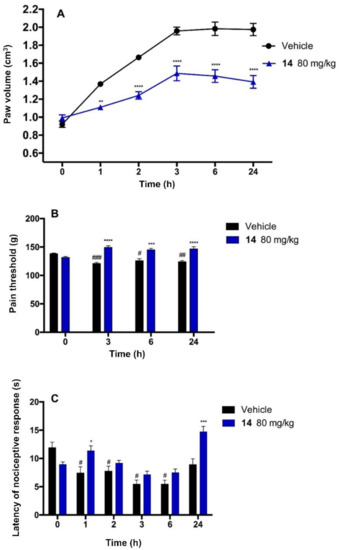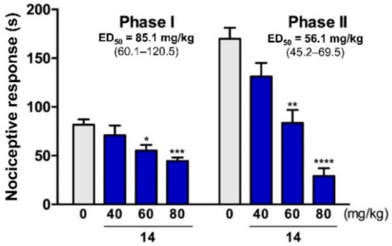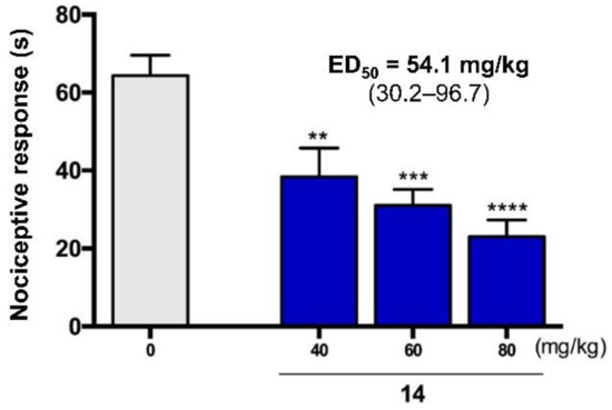 | 14 | 0.5 | 49.6 (44.3–55.7) | 31.3 (18.2–53.9) | 67.4 (58.2–92.1) | 168.7 (146.3–194.5) | 3.4 (MES) 5.4 (6 Hz) 1.4 (scPTZ) |