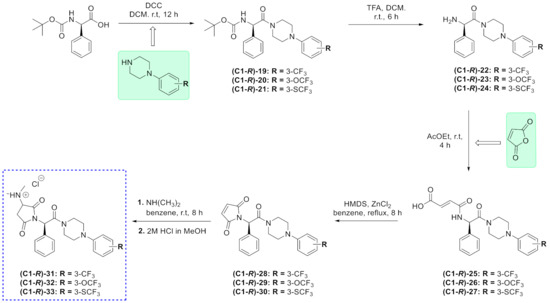 3.1.4. Synthetic Procedure for Unsaturated pyrrolidine-2,5-dione Derivative (10–12, (C1-R)-28–(C1-R)-30) and (C1-S)-28