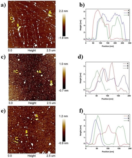 AFM images with corresponding height profiles of gCN (a,b), 500-2 (c,d), and 500-4 (e,f).