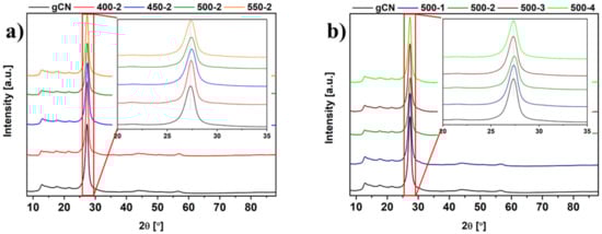 XRD patterns of studied samples are presented in Figure 2. All materials displayed a similar crystalline phase with two characteristic reflections at approximately 13° and 27° assigned to the (100) and (002) planes, respectively (JCPDS: 01-087-1526). The aforementioned reflections have been attributed to the in-plane packing motif of tri-s-triazine units and the interplane periodic stacking of the layers along the c-axis, respectively [,,]. The comparison of XRD data shows position shifts and changed intensity. More specifically, the (002) diffraction peak is shifted from 27.33° for reference gCN to 27.44° for 500-2, implying structural changes caused by annealing in the H2 atmosphere. The shifts to higher angles while treatment with higher temperature cause the interlayer spacing to decrease. Similar dependence shifts are commonly reported in state of the art with g-C3N4 prepared at higher temperatures [,,]. These observations are consistent with the decrease in the interlayer distance that occurred due to the further condensation induced through the additional thermal treatment of the gCN, resulting in a more stable structure within the layers [].