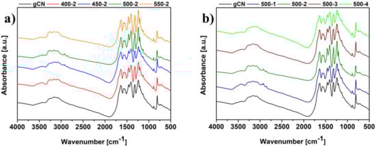 FTIR spectra of gCN prepared under different conditions: temperature dependence (a), and time dependence (b).