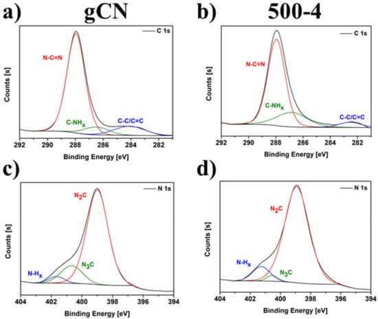 C 1s and N 1s XPS spectra of gCN (a,c), and 500-4 (b,d).