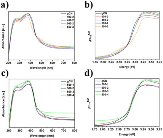 DR/UV-vis spectra of gCN prepared at different temperatures (a), Tauc plot of gCN prepared at different temperatures (b), DR/UV-vis spectra of gCN prepared at different times (c), Tauc plot of gCN prepared at different times (d).
