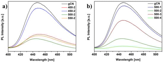 Figure 7 presents the photoluminescence spectra of the studied samples. The reference gCN exhibits a strong emission peak centered at 450 nm, resulting from the fast recombination of photogenerated charge carriers []. All modified materials show notably extinct PL peaks with the increase in the temperature and duration of treatment. The PL spectrum of 500-4 shows the lowest PL intensity as compared to reference gCN, indicating the lowest rate of photogenerated carrier recombination, which is beneficial for photocatalytic performance. Broadened optical absorption in the visible range, higher specific surface area, and lower recombination rate of the hydrogen-treated carbon nitrides suggest boosting photocatalytic activity [].