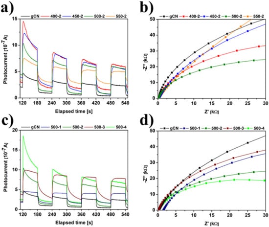 The H2 treated carbon nitrides provide electron donors (the introduction of hydrogen to the g-C3N4 can be interpreted as reductive or n-type doping), introducing defects on its surfaces, therefore improving the carrier mobility of as-modified materials [,,]. Considering temperature dependence (Figure 8a,b), it was noticed that all modified samples show improved photocurrent response, and the semicircles are smaller, which is desirable in photocatalytic performance. To be more specific, the highest photocurrent response is achieved for 450-2, which is 2.68 times higher than pristine gCN. An analogy is observed in the case of time dependence (Figure 8c,d). Here, the highest photocurrent response is achieved for 500-4 (3.14 times higher than reference gCN). Consequently, the photogenerated carriers are better transferred and separated on the surfaces of modified carbon nitrides intersperse to higher photocatalytic activity. Hence, annealing of graphitic carbon nitride in the hydrogen atmosphere results in different chemical structures, surface area and porosity, optical and electrochemical properties, which all will affect the photocatalytic activity [].