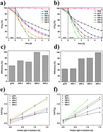 The photocatalytic efficiency of the studied catalysts was investigated in the RhB degradation process under visible light illumination (Figure 9). RhB without the addition of a catalyst displayed irrelevant self-decomposition with the assistance of visible light irradiation. All modified samples show gradually enhanced photocatalytic activity. As shown in Figure 9a, a higher temperature of annealing in H2 atmosphere up to 500 °C led to an increase in the efficiency of decomposition of RhB. An increase in the temperature of H2 treatment up to 550 °C decreased the removal efficiency of RhB. This is due to the much higher value of bandgap energy (2.81 eV), which influenced a decrease in optical and electrochemical properties of 550-2. The data collected from photoluminescence, chronoamperometry, and electrochemical impedance spectroscopy proves that the transfer and separation of photogenerated carriers are hampered in comparison to sample with the highest photoactivity (500-4) in the RhB degradation process. Among the temperature-dependent samples, 500-2 has the highest efficiency, 1.27 times higher than that of pristine gCN. In the case of time-dependent samples (Figure 9b), 500-4 catalyzed the complete decomposition of dye after 1.5 h of irradiation (1.76 times higher compared to gCN). Additionally, the histograms of photocatalytic effectivity are presented in Figure 9c,d. The boosted photocatalytic activity was explained by enhanced specific surface area, improved transfer, and separation of photogenerated carriers, successful exfoliation, and nitrogen vacancies presence achieved during H2 treatment []. Finally, it is revealed that the changing trend of photocatalytic RhB decomposition of samples prepared under different conditions is in good agreement with their photoluminescence spectra and electrochemical measurements. Additionally, the first-order constants (k) for photocatalytic RhB degradation over modified materials were calculated by ln(C/C0) = -kt. The time-course variations of ln(C/C0) of the samples different versus temperature were shown in Figure 9e and versus time in Figure 9f. The kinetic constants (k) with their R2 are listed in Table S4. The obtained results showed that the time of annealing in H2 has a crucial impact on photocatalytic efficiency.