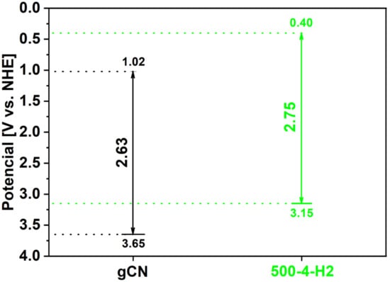 Furthermore, these samples’ conduction bands (CB) positions were calculated from the formula ECB = Eg − EVB. The value of conduction bands of gCN and 500-4 were calculated to be 1.02 and 0.40, accordingly. The energy band structures of gCN and 500-4 are shown in Figure 10. Both the VB and CB of 500-4 are located higher in comparison to the reference gCN. Additionally, the CB value of 500-4 is more negative than that of E0 (redox potential of O2/•O2− = −0.046 eV vs. NHE) due to the conduction band potential, resulting in easy transformation of dissolved oxygen molecules into superoxide anion radicals (O2−) to response easily to RhB dye molecules, which are the main active species of photodegradation of RhB dye. Additionally, the VB potential of 500-4 is not more positive than that of E0 (•OH/OH− = 1.99 eV vs. NHE); thus the holes (h+) could not oxidize OH−/H2O to generate hydroxyl radicals (•OH) directly in 500-4 photocatalytic process []. However, •OH can be produced from the reaction between •O2− and H2O2, accelerating the photocatalytic activity []. Moreover, the ability of the organic dye itself decomposition should be considered []. In this case, the dye molecule can provide the electron to 500-4 through the irradiation process. Cationic RhB molecules are adsorbed on the surface of the catalyst. Then, the electrons of organic dye are excited under the visible light to generate the excited electrons starting the photocatalytic reactions [].