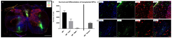 With our current study, we are thus able to demonstrate that long-term survival of transplanted NPCs and their subsequent direct, as well as indirect effects on secondary injury processes and neuropathological neuroregeneration do have an impact on functional recovery even after a severe and clinically relevant contusion/compression injury of the cervical spine. Given the low survival rate of the transplanted NPCs in our experiment as well as in comparable studies, their observed neuroprotective and neuroregenerative properties, even in such small quantities, are indeed remarkable [20,30,33,47,61]. While not assessed in our current experiment, it is noteworthy that transplanted NPCs have been associated with a reduction of neuropathic pain after SCI in animal models as well, possibly mediated by paracrine release of anti-inflammatory cytokines or the general attenuation of the cellular inflammatory response [70,71]. Future studies, therefore, should focus on synergistic treatment approaches, combining NPC-transplantation with, e.g., neuroprotective agents or interventions to increase survival and differentiation of the engrafted NPCs, which might considerably increase their neuroregenerative potential.