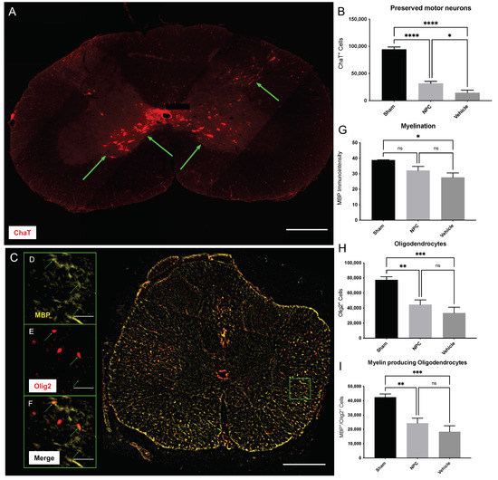 Spared motor neurons, oligodendrocytes, and myelination in the injured spinal cord eight weeks after severe cervical SCI. (A) Spinal cord cross-section of an NPC animal stained for the motor neuron marker ChaT, indicating spared motor neurons (green arrows) in the ventral grey matter at 10× magnification (scale bar = 500 µm). (B) Significantly more ChaT+ motor neurons could be observed in NPC animals (group 1) compared to Vehicle animals (group 2; n = 8 animals per group; one-way analysis of variance (ANOVA) with post-hoc Tukey-HSD-test; p = 0.0336). (C) Spinal cord cross-section of a Vehicle animal stained for the oligendroglial marker Olig2 and the surrogate marker for myelin MBP at 10× magnification (scale bar = 500 µm). (D–F) Enlargement of the green framed inlet in (C), depicting the close spatial relationship (green arrows) of active Olig2+ oligodendrocytes and MBP at 40× magnification (scale bar = 50 µm). (G) The immuno-intensity of the MBP-staining and thus the extent of myelination showed no significant difference between NPC animals and Vehicle animals (n = 8 animals per group; one-way ANOVA with post-hoc Tukey-HSD-test; p = 0.3945). Similarly, the number of Olig2+ oligodendrocytes (H) and Olig2+/MBP+ active oligodendrocytes (I) were not significantly higher in NPC animals compared to Vehicle animals (both n = 8 animals per group; one-way ANOVA with post-hoc Tukey-HSD-test; p = 04549) (* p < 0.05; ** p < 0.01; *** p < 0.001; **** p < 0.0001 and ns = not significant).