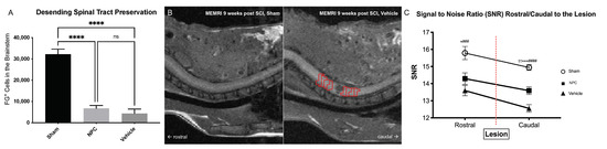 In addition, we used manganese-enhanced magnetic resonance imaging (MEMRI) to objectify the perilesional preservation or regeneration of ascending and descending spinal tracts eight weeks after SCI. The overall signal-to-noise ratio (SNR) of the cervical and thoracic spinal cord was significantly increased after intrathecal application and subsequent axonal uptake of Mn2+ compared to natively scanned animals (15.79 ± 1.48 vs. 8.22 ± 0.31, p < 0.0001). Rostral to the lesion, SNR was highest in Sham animals (group 3; 15.79 ± 0.38; Figure 3B,C) followed by NPC animals (group 1; 14.29 ± 0.34), while animals in the Vehicle group already showed the lowest SNR values (group 2; 13.6 ± 0.3; Figure 3B,C). The differences in SNR were significant between Sham and Vehicle animals (p = 0.0002) as well as Sham and NPC animals (p = 0.0136) but not between NPC and Vehicle animals (p = 0.272). The difference of mean rostral and mean caudal SNR and thus the SNR decrease along the spinal cord and in injured animals also across the lesion was only significant in the Vehicle group (1.04 ± 0.1, p = 0.007) and not in the Sham but also not in the NPC group (0.82 ± 0.1, p = 0.53 and 0.70 ± 0.14, p = 0.09). Therefore, SNR caudal to the lesion did not only show a significant difference between Sham and Vehicle/NPC animals (14.94 ± 0.17 vs. 12.55 ± 0.22/13.59 ± 0.22, p < 0.0001 and p = 0.0004 respectively; Figure 3C) but in contrast to the findings rostral to the lesion also between NPC and Vehicle animals (p = 0.0017).