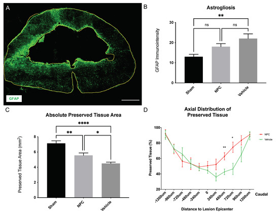 These findings suggest that the transplantation of NPCs does not affect the extent of reactive astrogliosis around the lesion but the amount of preserved tissue more caudal to the lesion in the chronic phase after severe cervical SCI.
