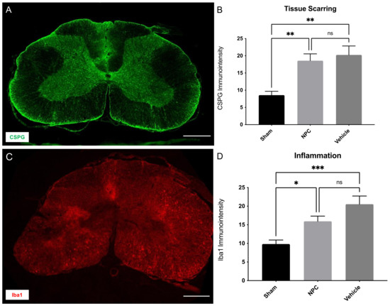 Tissue scarring and inflammation in the injured spinal cord eight weeks after severe cervical SCI. (A) Spinal cord cross-section of an NPC animal stained for CSPG, a marker for proteoglycans in the extracellular matrix at 10× magnification (scale bar = 500 µm). (B) The immuno-intensity of the CSPG-staining and thus the extent of tissue scarring showed no significant difference between NPC animals (group 1) and Vehicle animals (group 2; n = 8 animals per group; one-way ANOVA with Tukey-HSD-test; p = 0.8281). (C) Spinal cord cross-section of a Vehicle animal stained for Iba1, a marker for macrophages at 10× magnification (scale bar = 500 µm). (D) The immuno-intensity of the Iba1-staining and thus the number of Iba1+ macrophages was not significantly reduced in NPC animals compared to Vehicle animals (n = 8 animals per group; one-way ANOVA with Tukey-HSD-test; p = 0.1468) (* p < 0.05; ** p < 0.01; *** p < 0.001 and ns = not significant).