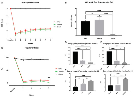 Functional recovery from baseline until eight weeks after severe cervical SCI. (A) While Sham animals (group 3; n = 8 animals) received 21 points on the BBB score at every timepoint, no significant difference in the BBB score could be observed between NPC animals (group 1) and Vehicle animals (group 2) throughout the experiment and recovery of injured animals generally remained low (n = 13 animals in the NPC group and n = 9 animals in the Vehicle group; two-way repeated measures ANOVA with Tukey test for multiple comparisons). (B) Similarly, assessment of fine motor control with the Gridwalk test revealed no significant difference between the NPC and the Vehicle animals at the end of the experiment (n = 13 NPC animals, n = 9 Vehicle animals and n = 8 Sham animals; one-way ANOVA with Tukey-HSD-test; p = 0.7984). (C) In contrast, the “Regularity Index” of the more objective CatWalk XT automated quantitative gait analysis as a measurement for coordination was significantly improved in NPC animals compared to Vehicle animals eight weeks after the injury (n = 13 NPC animals, n = 9 Vehicle animals and n = 8 Sham animals; two-way repeated measures ANOVA with Tukey test for multiple comparisons; p = 0.0051). Furthermore, while indifferent for the front limbs (D), the “Swing Speed” of the hindlimbs (E) in the CatWalk XT automated quantitative gait analysis was significantly improved in NPC animals compared to Vehicle animals eight weeks after SCI, suggesting less limping after NPC-transplantation (n = 13 NPC animals, n = 9. Vehicle animals and n = 8 Sham animals; Kruskal–Wallis test followed by Dunn’s multiple comparisons test; p = 0.0959 and p = 0.0158, respectively). Similarly, the “Base of Support” indicating trunk stability and weight-bearing when decreased was significantly lower in NPC animals compared to Vehicle animals at the end of the experiment in both, the front limbs (F) and the hindlimbs (G); n = 13 NPC animals, n = 9 Vehicle animals and n = 8 Sham; Kruskal–Wallis test followed by Dunn’s multiple comparisons test; p = 0.0006 and p < 0.0001, respectively) (* p < 0.05; ** p < 0.01; *** p < 0.001; **** p < 0.0001 and ns = not significant).