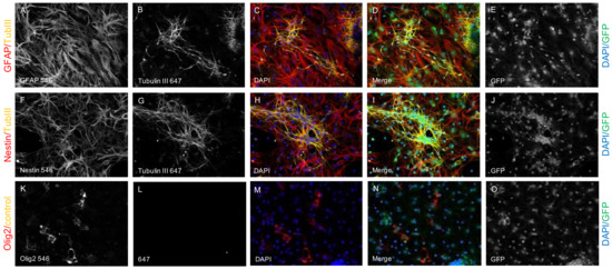DAPI+ (blue) and GFP+ (green) cells are expressing Nestin ((F), red) and are thus identified as viable NPCs ((I), green/blue/red). The tripotential differentiation capacity of the NPCs is assessed by costaining of GFP ((E,J,O,D,I,N), green) and DAPI ((C,H,M,D,I,N), blue) with TubIII ((B,G,C,H,D,I), yellow), GFAP ((A,C,D), red) and Olig2 ((K,M,N), red) indicating viable NPC-derived neurons ((D,I), green/blue/yellow), viable NPC-derived astrocytes ((D,I), green/blue/red) and viable NPC-derived oligodendrocytes ((N), green/blue/red). respectively. Only the secondary antibody (Alexa-647) has been used as a negative control (L).