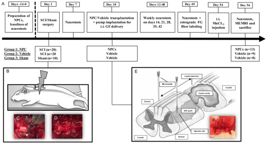 (A) Timeline of the study interventions (e.g., pump implantation for i.t. growth factor (GF) delivery at day 10 or manganese-enhanced magnetic resonance imaging (MEMRI) at day 56), also indicating the group design and the group sizes at the beginning and at the end of the experiment. (B) The contusion-compression SCI is performed at day 1 with a modified aneurysm clip (C), leaving a visible injury on the exposed cervical spinal cord at the C6 level (D). (E) Modified after (47)—NPCs are transplanted into the spinal cord at four distinct sites via stereotactic injection (F) at day 10.