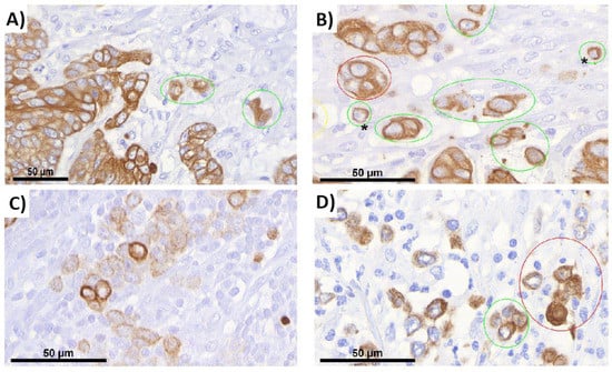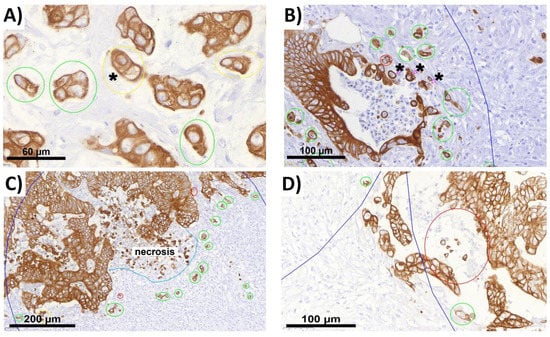 Budding analysis—cell properties. Histological specimens were stained using antibodies AE1/AE3 according to the manufacturer’s recommendations. They were scanned using 3DHISTECH PANNORAMIC 250 Flash II with a CIS VCC camera (3DHISTECH Ltd., Budapest, Hungary) and a 40× Plan-Apochromat objective (Karl Zeiss, Jena, Germany) and a resolution of 0.194 µm/pixel, scan compression setting 80 jpg. The digital slides were analyzed using CaseViewer (Ver. 2.4., 3DHISTECH Ltd., Budapest, Hungary). Tumor buds were marked in pictures using the annotation tool in CaseViewer. The different histological aspects of cell properties that were important for analyzing buds can be seen in (A–D). The cells marked with a green circle were those considered as real buds, whereas cells marked with a red circle did not fulfill the criteria to be considered buds. (A) Low intensity staining: the cells on the left side marked in green have a lower staining intensity than the cells on the right. There are weakly stained cells in the tumor. Therefore, the staining intensity of cells on the left side is an average of the staining intensity of the whole tumor, and they were considered as buds on this basis. Magnification: 62.1×. (B) Incomplete circumference: the cells marked with (*) do not have a continuous circumference. They were still considered buds because the circumference exceeds 50% of the cell. Morphologically, the cell is very similar to a tumor cell. It has a light halo and has a size comparable to the average cell size of the rest of the surrounding tumor cells. Magnification: 102.8×. (C) Positive and negative cells: as shown, strongly stained cells can be found at the center of a group of many negative cells. Positive cells can mistakenly be evaluated as real buds. The negative cells must also be considered and are very close. They form a unit together with the strongly stained cells and thus exceed the maximum count of 4 for a real bud. Therefore, the strong positive cells are not considered a bud. Magnification: 102.8×. (D) Cell count limit: the image shows the limit for maximum cell numbers at which a cell group is no longer considered a bud (>4 cells). The cell group marked in green consists of four cells and thus fulfills the criterion regarding the maximum cell count of a bud (considering distance to other groups of cells). The cell group marked in red consists of five cells. This exceeds the maximum number and, thus, cannot be considered a bud. Magnification: 102.8×.