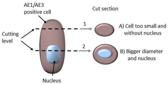 Scheme for cell truncation (for AE1/AE3). Cell components are stained differently: in Cutting Level 1 with positive cytoplasm and without a representative nucleus (negative) (A) and in Cutting Level 2 with a representative nucleus (B). Nevertheless, this effect occurs in all section preparations, including HE, and thus always influences the interpretation of morphology in any staining.