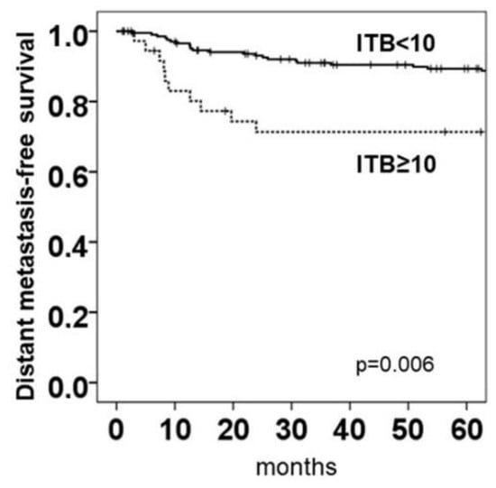 The Kaplan–Meier plots for counting off intratumoral buds in ngTMA® using pancytokeratin staining revealed a cut-off of ≥10 buds to be unfavorable for distant metastasis-free survival (p = 0.006, cut-off ≥10 buds; Figure 4). The cut-off was defined by the maximum value from one of two/three blind punched ngTMAs® (which is equivalent to a blindly selected region of interest (ROI) rather than a hot spot selected in the whole slide). Only 29 patients out of 209 (13.9%) with NOS adenocarcinoma that had an ITB score <10 died of the disease, whereas 11 of 36 (30.5%) patients died of the disease when they had tumors with an ITB score ≥10 (p = 0.006). There was no significant correlation between ITB and overall survival (OS) (p = 0.441).