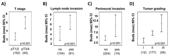 A high budding score was significantly associated with a higher tumor grade, higher pT stages, a higher lymph node metastasis, and a higher perineural invasion (Table 1, Figure 5A–D), but was not associated with a lymphatic invasion (Figure S1). Interestingly, the ITB score was not associated with the MSI vs. MSS status as a molecular marker, or with sex, age, venous invasion, or tumor localization (left- or right-sided colon).