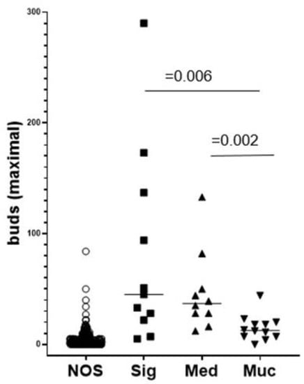 Comparison of NOS and histological subtypes regarding the distribution of max bud counts in each type of colon cancer using two-tailed, unpaired, and non-parametric Wilcoxon–Mann–Whitney testing. Calculated with SPSS Version 26, IBM (Armonk, New York, NY, USA). NOS compared with the subtypes of signet ring cell, medullary, and mucinous adenocarcinoma (p < 0.001). It can be seen that for NOS and mucinous carcinomas, most patients have low ITB scores. For signet ring cell and medullary carcinoma, however, most patients are in the range corresponding to high ITB scores.