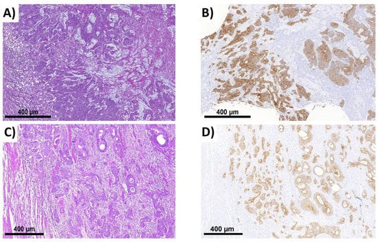 For improved differentiation between inflammatory cells and those decomposing the tumor, the usage of pancytokeratin staining is recommended because tumor buds can be more easily found compared with using HE []. Punches of NOS adenocarcinoma and histological subtypes were stained using the antibodies AE1/AE3 according to the manufacturer’s recommendations (Zytomed Systems GmbH, Berlin, Germany), (Figure 7) []. The antibody for AE1 recognizes the acidic (type I) cytokeratins 10, 15, 16, and 19. The antibody of the AE3 clone recognizes all known basic (type II) cytokeratins, i.e., CK1 to 8. Antibodies were used at a dilution of 1:40. Sections were first pretreated with a citrate buffer at pH 6.0 and incubated at a working dilution of 1:100 for 30 min according to the manufacturer’s recommendations.