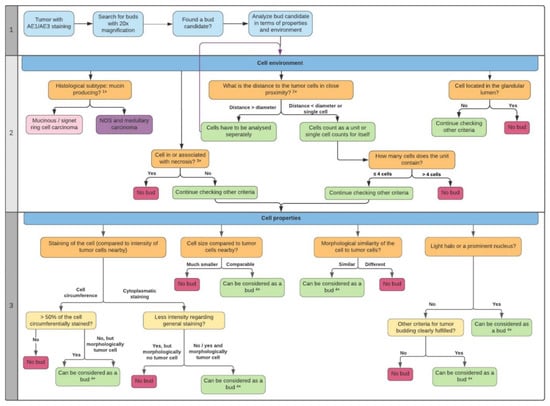 Throughout this the process, refinements in criteria were achieved, a flowchart was created, and tumor buds were retrospectively redefined. During our evaluation, we focused on the criteria of the bud or cell environments as well as the cell properties. This led to a manual for detecting and defining tumor buds (Figure 8).