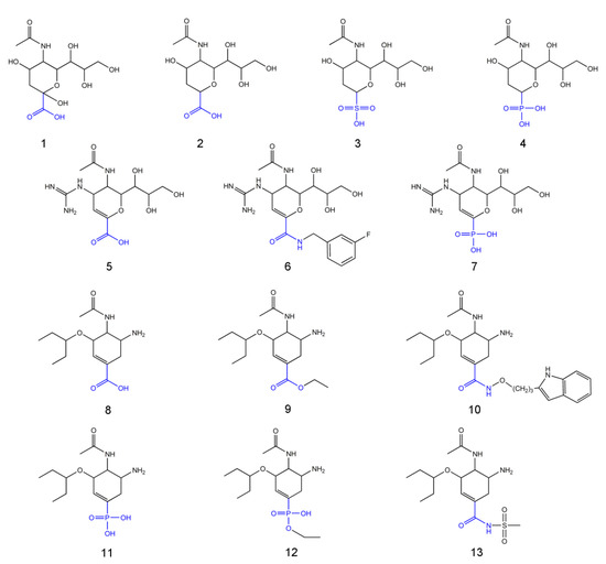 Chemical structures of sialic acid (1), deoxysialic acid (2), its sulfonic and phosphonic analogues (3, 4), zanamivir (5), an amide derivative of zanamivir (6), a phosphonic analogue of zanamivir (7), oseltamivir carboxylate (8), oseltamivir (9), a hydroxamic derivative (10), a phosphonic analogue of oseltamivir and its ethyl ester (11, 12), and an analogue containing a sulfonamide group (13). The functional group that can interact with the arginine triad is highlighted in blue.
