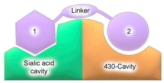A possible solution would be to create bifunctional compounds that occupy the sialic acid binding cavity and the adjacent 430-cavity (Figure 2). It is assumed that, when using bifunctional inhibitors, mutations in one of the binding sites may be less critical if effective interactions with another site are maintained, which, in turn, can hinder the selection of resistant mutant strains of the virus [17,18]. This approach allows the creation of more effective inhibitors, the use of which reduces the risk of resistance due to complex interactions with the target protein. The 430-cavity was identified as an additional binding site in N1 and N2 neuraminidases that could be targeted by inhibitors; its hydrophobic surface is formed with conserved residues Pro326, Ile427, and Thr439 [19,20,21,22,23]. The arginine triad Arg118-Arg292-Arg371, located at the interface between the sialic acid binding site and 430-cavity, interacts with the carboxyl group of the sialic acid residue. This interaction plays a key role in the binding of both the substrate and competitive inhibitors of neuraminidase [8,24,25], which should be taken into account when designing bifunctional compounds.