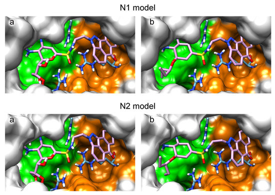 The sulfonamide group, widely used in medicinal chemistry, can serve as an acceptor of hydrogen bonds and is resistant to hydrolysis [32,39,40]. Hydrogen bonds between the oxygen atom of the sulfonamide fragment of the ligand and the arginine residue can be observed in many protein complexes taken from the Protein Data Bank (Table S1). Interestingly, the Protein Data Bank contains complexes with sulfonamide derivatives of pyranose structurally similar to sialic acid (Table S2), but these compounds were used as inhibitors of carbonic anhydrases and did not interact with arginine residues. To assess the possibility of the formation of key interactions with the arginine triad Arg118-Arg292-Arg371, the structures of sulfonamide analogues of known neuraminidase inhibitors were modeled and docked into the active site of N1 and N2. Figure 4 shows poses of zanamivir and oseltamivir analogues with terminal (unsubstituted), methylated, and dimethylated sulfonamide groups. All compounds are optimally positioned in the sialic acid binding site and form four hydrogen bonds with the arginine triad (Figure 3c, Table S3). Poses in the active site of N1 and N2 neuraminidases are very similar, what can be explained by the strong similarity of the binding sites. The introduction of methyl substituents has no significant effect on the position of the functional group as well as on calculated binding energy (Table S4), suggesting the possibility of further elongation of the inhibitor’s structure towards the 430-cavity.