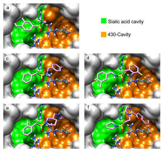 The selected unsubstituted, monosubstituted and disubstituted sulfonamides can be divided into groups according to the orientation of the S–N bond in the N1 active site. In the first case, the S–N bond is oriented towards the 430-cavity (as in the analogues of zanamivir and oseltamivir); in the second, towards the sialic acid binding site (Table 2, Figure 6). Monosubstituted and disubstituted compounds can be oriented in both directions thus providing more opportunities for the design of sulfonamide inhibitors. Interestingly, the incorporation of the nitrogen atom into the heterocycle does not prevent binding both in the sialic acid cavity and 430-cavity (Figure 6e,f). Docking poses of the selected sulfonamides in the active site of the N2 model were very similar to N1 (Figure S5).