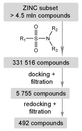 3D structures of known inhibitors and their derivatives were generated using the CORINA Classic Web service [47]. Compounds were docked into the active site of the N1 and N2 models with Lead Finder 1.1.16, in ‘extra precision’ mode [48,49]. The center of an energy grid box corresponded to carbon coordinates in the carboxyl group of zanamivir, and lengths of box edges were 25 Å. Virtual screening was performed among low-molecular-weight compounds of the ZINC12 library (‘clean leads’ subset) [50,51], as shown in Figure 7. Molecules containing sulfonamide groups were retrieved using a substructure search in ACD/Spectrus DB 14.0 (https://www.acdlabs.com, accessed on 1 November 2021). Sulfonamides were docked into the active site of N1 model in standard mode of Lead Finder, and the obtained poses were subjected to structural filtration with vsFilt [52] to select compounds capable of forming hydrogen bonds with each residue of the arginine triad (Arg118, Arg292, Arg371). The following structural criteria were applied: the distance between guanidinium nitrogen and sulfonamide oxygen ≤ 3.1 Å, the corresponding angle N–H⋯O ≥ 150°. The selected compounds were redocked in the more rigorous mode ‘extra precision’ and were subjected to a more thorough structural filtration. An additional requirement at this stage was the presence of two hydrogen bonds with the Arg371 guanidinium group.