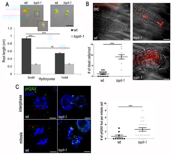 One possible origin of the previously observed mitotic chromosome bridges in topII-1 [] could be problems during DNA replication. This has been reported in other organisms where TOPII has been mutated [] or where its catalytic activity was blocked with inhibitors []. To investigate this, we assessed early root development in seedlings, since many cells in this tissue are undergoing DNA replication and mitosis. The topII-1 line displayed extremely short roots 14 days after sowing (0.26 ± 0.01 cm, n = 50; wild-type 0.94 ± 0.02 cm n = 50, t-test p < 0.001, Figure 1A). To test if TOPII has a role in the fork-stalled checkpoint pathway, wild-type and topII-1 seeds were grown in vertical MS plates with 1 mM of hydroxyurea (HU) (Figure 1A). HU delays DNA replication by limiting the amount of dNTPs available, and therefore, stalling replication forks []. As expected, wild-type root length was affected by the treatment, showing a reduction from 0.94 ± 0.16 cm to 0.55 ± 0.02 cm (n = 50, t-test p < 0.001). However, HU treatment did not result in an additional reduction in root growth in the topII-1 mutant (0.26 ± 0.01 cm n = 50 vs. 0.27 ± 0.01 cm n = 46 after HU, t-test p = 0.613). Thus, root growth in the mutant is not further compromised by the inhibitor treatment.