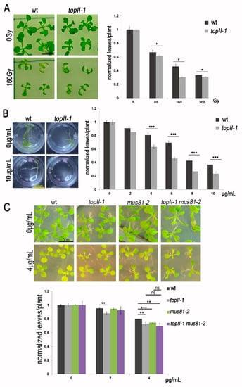 Sensitivity to ionising radiation was performed using an X-ray machine with a cobalt source []. Plants were exposed after germination to 0, 80, 160 and 300 Gy. The number of leaves was assessed after 14 days growth in long day conditions at 20 °C. Mitomycin C sensitivity was assessed in liquid culture [] at 0, 2, 4, 6, 8 and 10 µg/mL for wild-type and topII-1, and in MS plates at 0, 2 and 4 µg/mL for wild-type, topII-1, mus81-2 and topII-1 mus81-2. Resistance to cisplatin treatment was evaluated in MS plates at 0, 10 and 15 µM for wild-type, topII-1, mus81-2 and topII-1 mus81-2 [].
