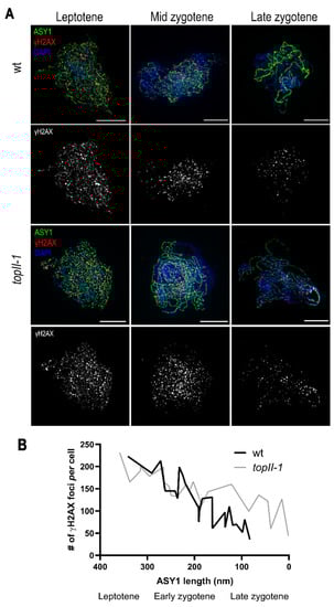 We have previously shown that despite an increased incidence of chromosome interlocks during meiosis in topII-1, CO formation via the HR pathway is completed and the plants are fertile []. However, as HR in mitotic cells is affected in topII-1, we investigated if progression of DSB repair during meiotic prophase I was normal. Meiotic progression in relation to DSB repair was monitored in chromosome spread preparations of pollen mother cells (PMCs) using dual-immunolocalisation of the chromosome axis component ASY1 and γH2AX foci to mark DSBs [] (Figure 3A).
