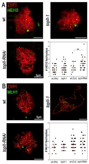Arabidopsis thaliana plants were supplied by the NASC (Nottingham Arabidopsis Stock Centre) and IJBP Arabidopsis Stock Centre. Arabidopsis ecotype Col-0 and Ws-0 were used as a control depending on the genetic background of the mutant lines. Plants were grown in a greenhouse with controlled temperature and humidity (20 °C and 60%, respectively) and summer photoperiod conditions (16 h light and 8 h darkness), and sown in a mixture of 4 parts M3 compost []. Mutant lines used in this study were the hypomorphic T-DNA insertion mutant topII-1 and the meiosis-specific topII-RNAi line controlled by a DMC1 promoter [], and the T-DNA mutant lines spo11-2-2 [], mus81-2 [] and mlh3-1 [].