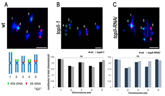 Finally, CO numbers were estimated by determining chiasma frequencies at metaphase I. Again, no difference between wt and topII-1 plants was found for either the chiasma frequency (8.35 ± 0.14 n = 57, 8.13 ± 0.17 n = 52, respectively, Mann–Whitney U test p = 0.376, Figure 5A,B) or the chiasma distribution between different homologous chromosome pairs (Mann–Whitney U test p > 0.1, Figure 5A,B). Similar results were obtained using the topII-RNAi with no significant differences found in mean numbers of chiasmata per meiosis (wild type 8.65 ± 0.16 n = 40, topII-RNAi 9.04 ± 0.15 n = 47, Mann–Whitney U test p = 0.079, Figure 5C) or the chiasma distribution between different pairs of homologous chromosomes analysed by FISH (Mann–Whitney U test p > 0.1, Figure 5C).