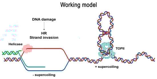 Working model of TOPII participation in the resolution of topological stress generated during HR. When DNA damage is repaired by homologous recombination, the DNA double-helix of the repair template needs to be uncoiled by the action of helicases to form a D-loop, thereby enabling strand invasion. This generates negative supercoiling of the DNA, which in turn is compensated by positive supercoiling at both ends of the D-loop. TOPII potentially relieves part of the mechanical stress generated in the vicinity of the HR intermediate, facilitating the repair process.
