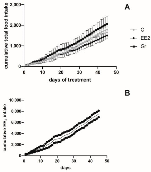 (A) Total cumulative food intake (g) of the different experimental groups for the 45 days that the treatments lasted. The data are represented as the mean value ± SEM of the duplicate tanks for each treatment. (B) The amount of EE2 ingested (µg) by the fish in each experimental tank is represented by circles, while the mean values of both tanks are represented by a black line. (C) The amount of G1 ingested (µg) by the fish in each experimental tank is represented by squares, while the mean values of both tanks are represented by a black line.