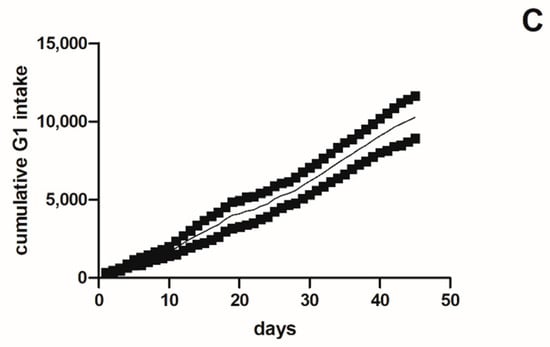 Dietary intake was measured in the three groups (C, EE2 and G1) and the cumulative total food intake was calculated for the 45 days that the treatments lasted. No statistically significant differences were observed among groups (Figure 1A). Thus, when the cumulative amount by each tank was analyzed, no differences were observed between the replicates (Figure 1B), neither for the EE2 nor G1 cumulative intake (Figure 1C).