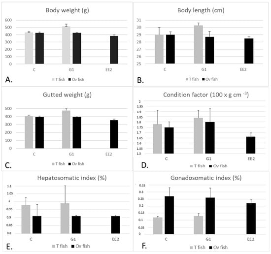 When comparing the body values of T fish between the C and G1 groups, the differences observed were not statistically significant, although T fish in the C group were smaller than T fish in the G1 group (Figure 2). Ov fish in C were similar to Ov fish in G1. On the other hand, when comparing the body parameters of T specimens versus Ov specimens from the three groups, we observed that most of the parameters were slightly higher in T than in Ov specimens (p > 0.05), except for GSI, which was higher in Ov than in T specimens. When comparing the values among Ov specimens of the three groups, the smallest body values were usually observed in the EE2 group (p > 0.05) (Figure 2).